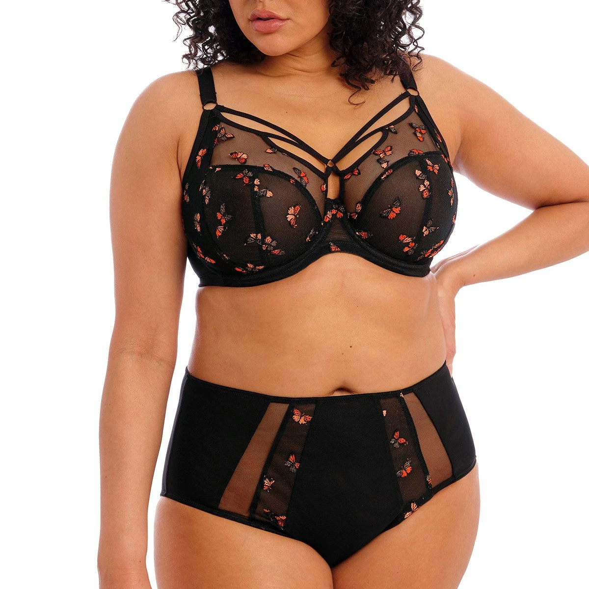 La culotte taille haute Sachi black butterfly d’Elomi vous sublimera grâce Ă ses empiècements transparents qui redessinent la silhouette. Coup de coeur pour les papillons brodĂ©s qui prennent vie dans des tons cuivre et bronze mĂ©tallique. Ce dessous confortable fera des merveilles jusqu’Ă la taille 50/52.