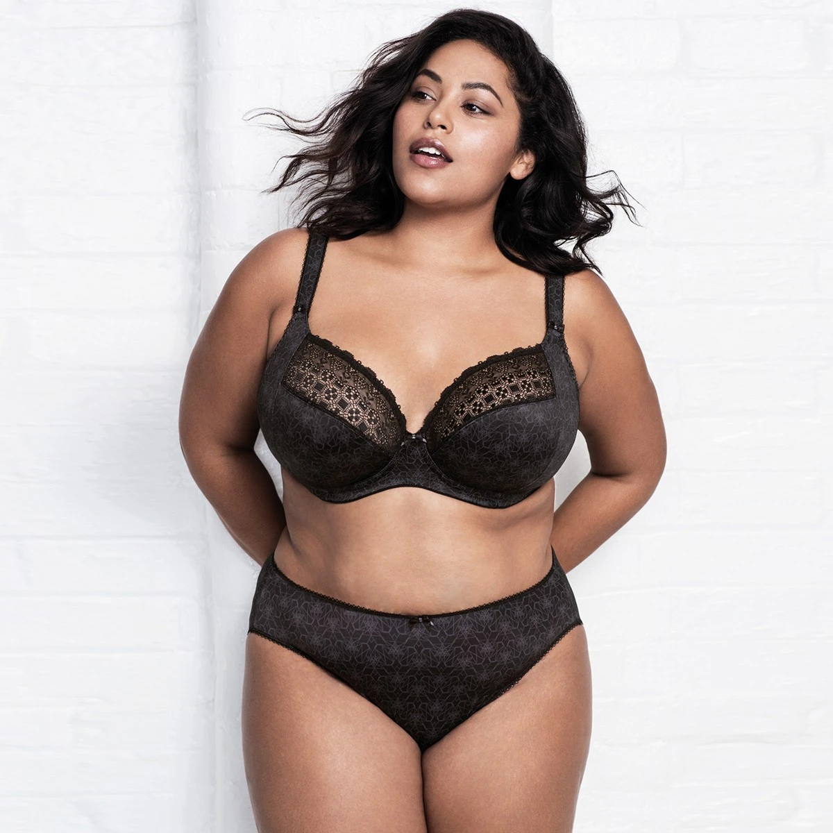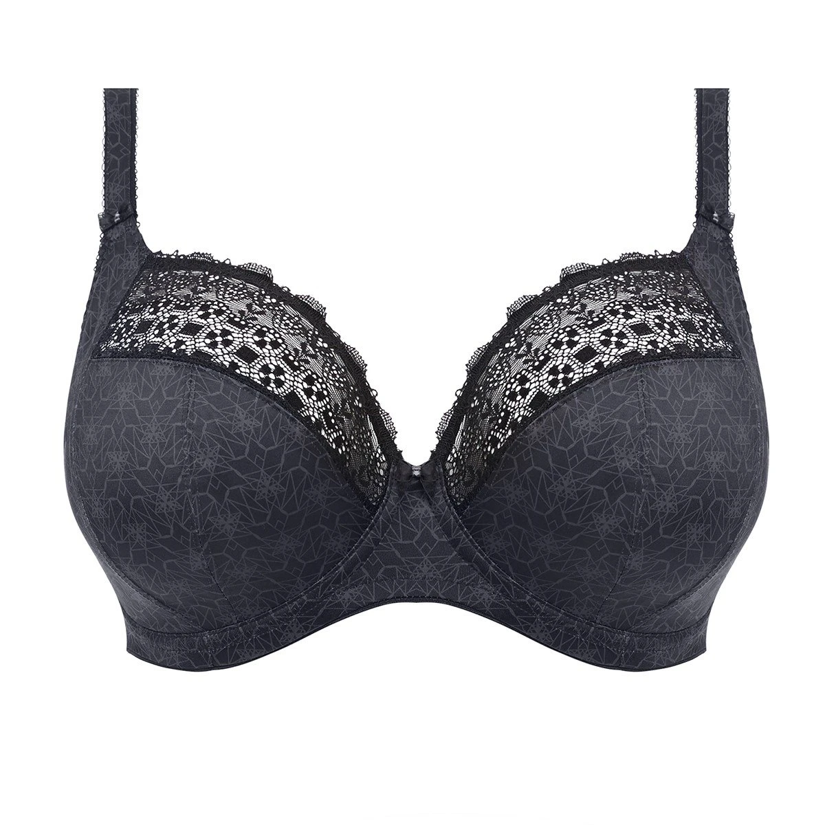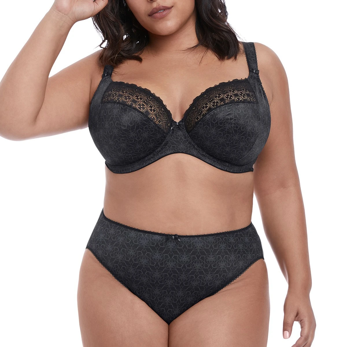 Le soutien-gorge grande taille Kim noir est une sublime lingerie imaginée par Elomi. On aime son imprimé ton sur ton et le raffinement de la dentelle géométrique qui orne les bonnets et apporte beaucoup de féminité à ce modèle. Ce soutien-gorge à armatures conçu pour les bonnets profonds est très confortable, sa coupe en 3 parties avec renforts latéraux donnera un beau galbe à votre poitrine.