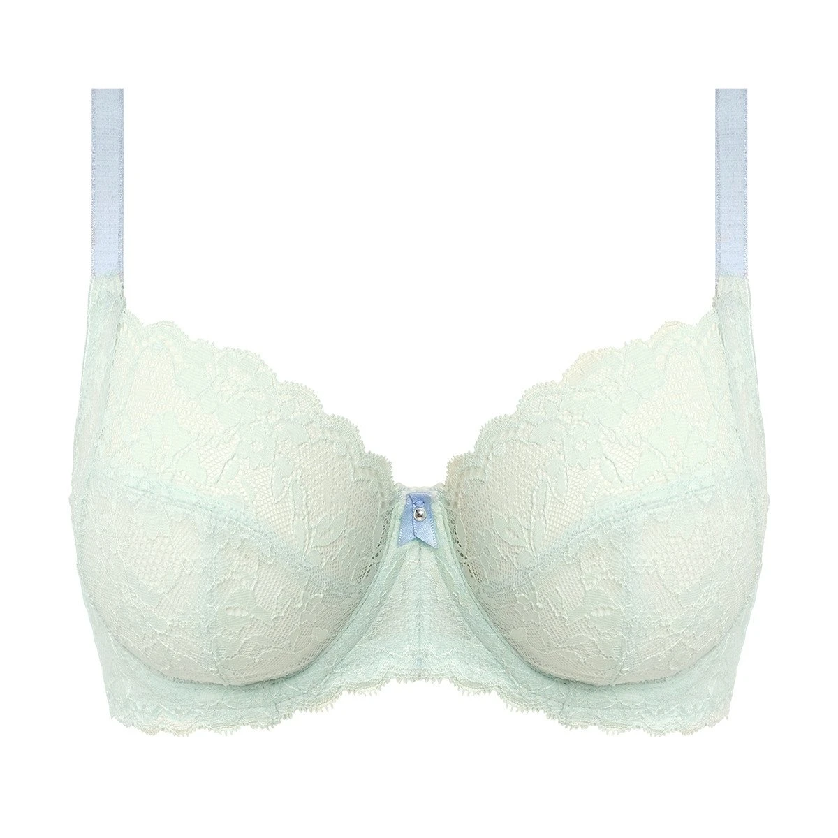 Le soutien-gorge en dentelle Ă armatures Offbeat Pure Water de Freya est conçu pour les poitrines gĂ©nĂ©reuses jusqu’au bonnet O. Il offre un maintien optimal tout en mettant en valeur la silhouette. Ce soutien-gorge possède des bonnets en 4 parties avec renfort latĂ©ral, permettant ainsi d’obtenir une poitrine galbĂ©e parfaitement rehaussĂ©e. Le bas des bonnets ainsi que les renforts latĂ©raux sont doublĂ©s, garantissant ainsi un maintien parfait et un galbe des plus sĂ©duisants. FabriquĂ©e Ă partir d’une dentelle stretch vert d’eau rĂ©sistante, avec une haute teneur en Lycra, ce soutien-gorge offre un maintien optimal. Les bretelles sont entièrement rĂ©glables et affichent une couleur contrastĂ©e en bleu pastel, ajoutant ainsi une touche de style Ă l’ensemble.