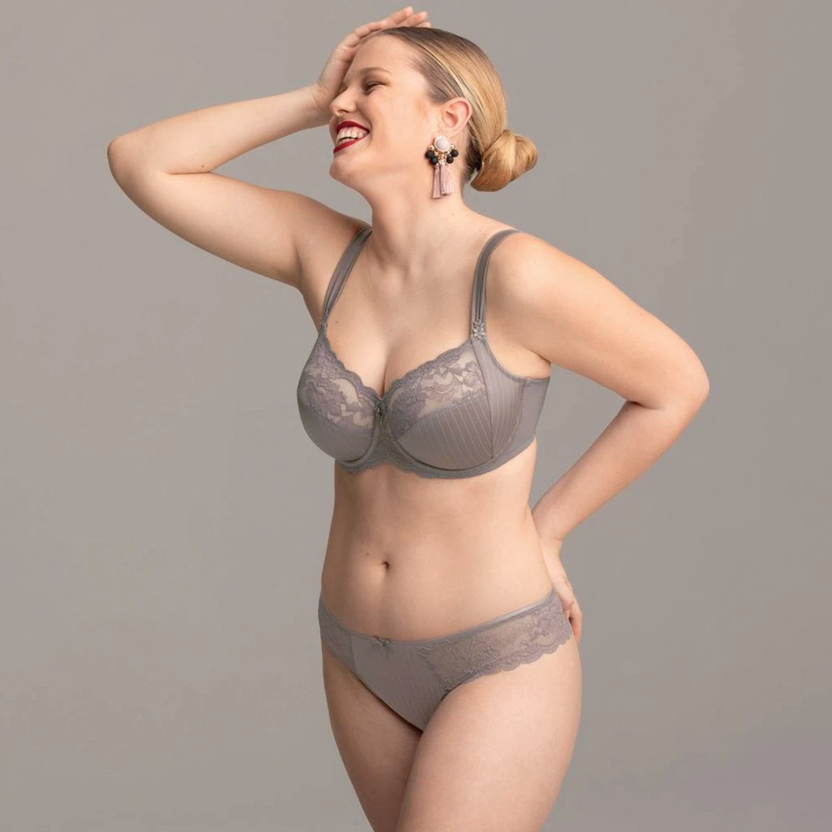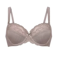 Le soutien-gorge Antonia gris cendré de Rosa Faia possède une microfibre rayée qui s’associe à merveille avec la dentelle sur le haut des bonnets. On apprécie ses bonnets en 3 parties avec renforts latéraux qui recentrent la poitrine et vous apporteront un bon maintien jusqu’au bonnet H. Coup de coeur pour le petit noeud de satin et sa jolie pampille à l’entre-seins.