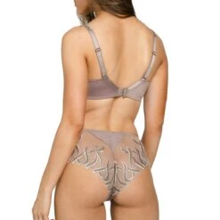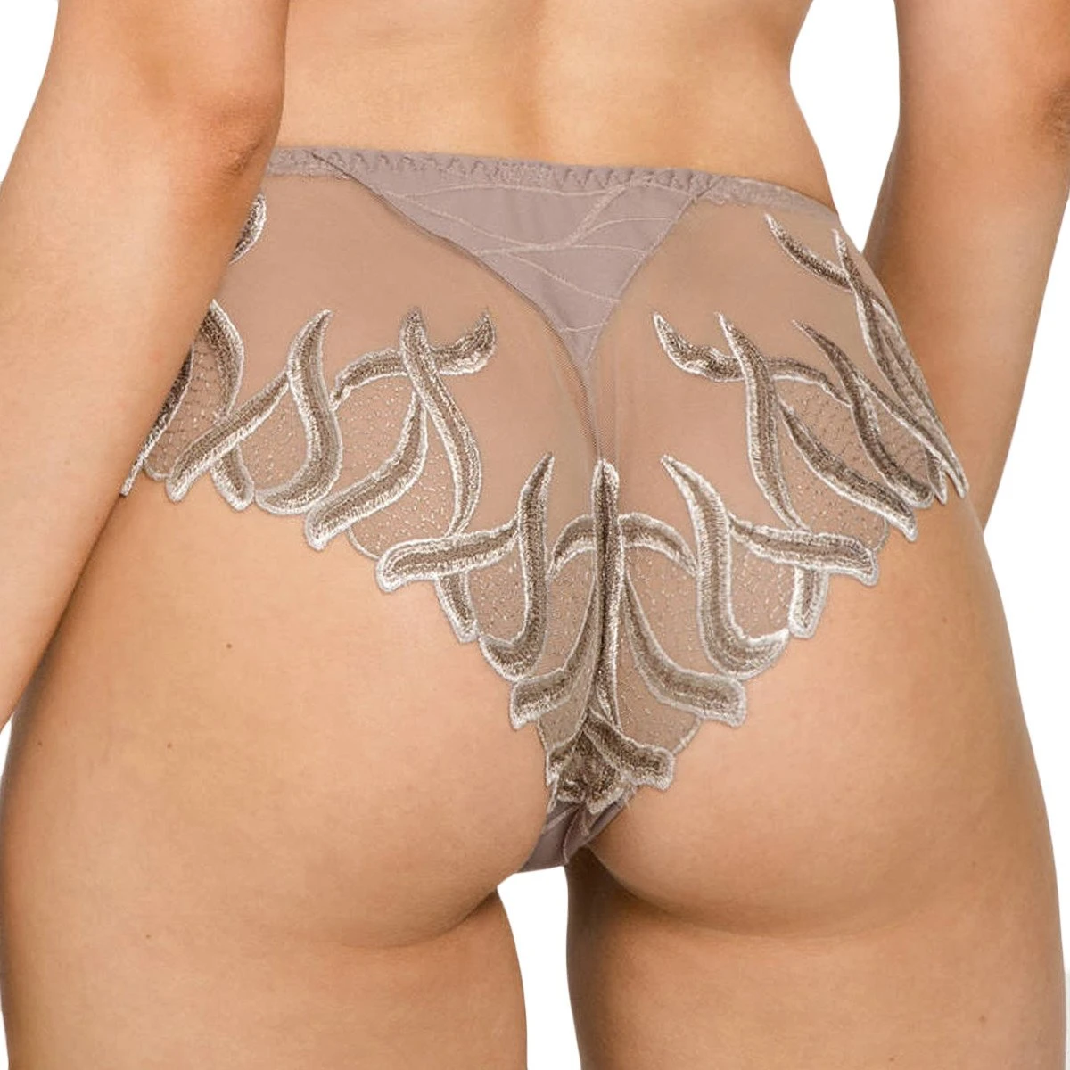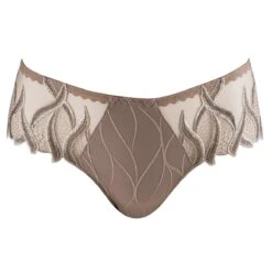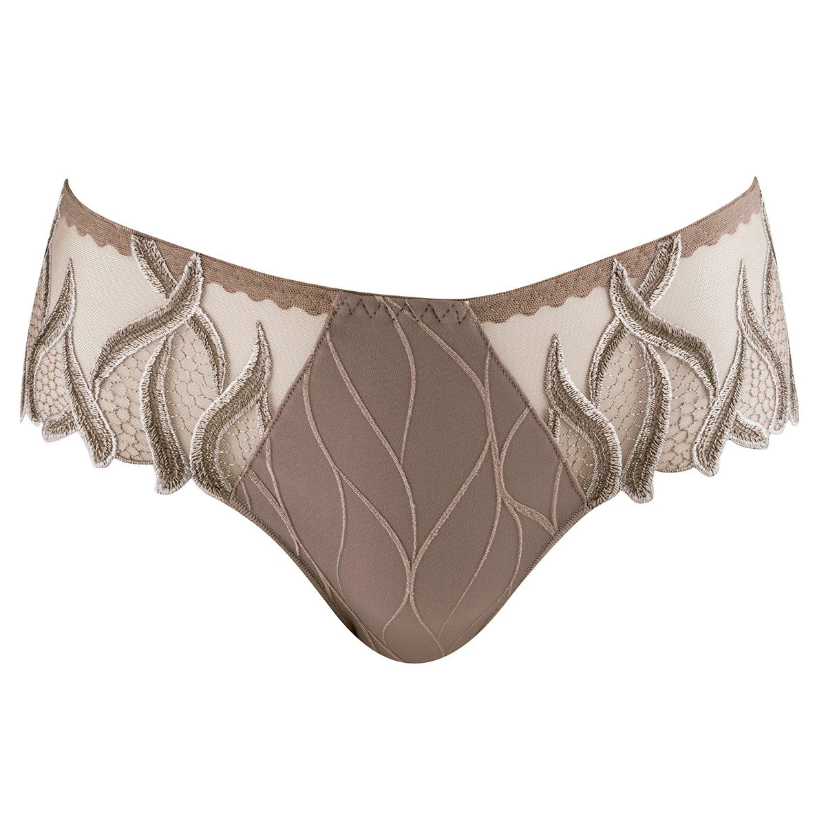 Le shorty Julia taupe confectionné par la marque Louisa Bracq possède une échancrure très sensuelle au niveau des fesses. On adore son tulle brodé d’ondulations finement irisées. Ce dessous raffiné reste invisible sous les vêtements grâce à sa finition en point mousse. Fond doublé coton, plastron en microfibre.