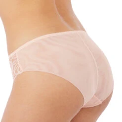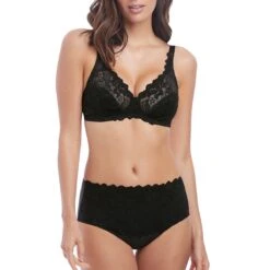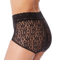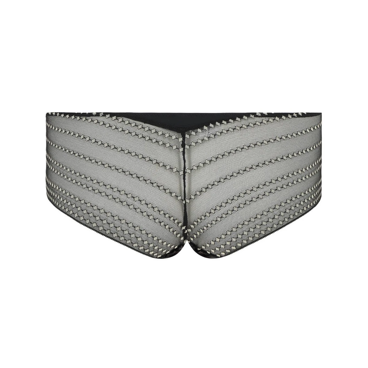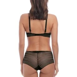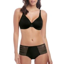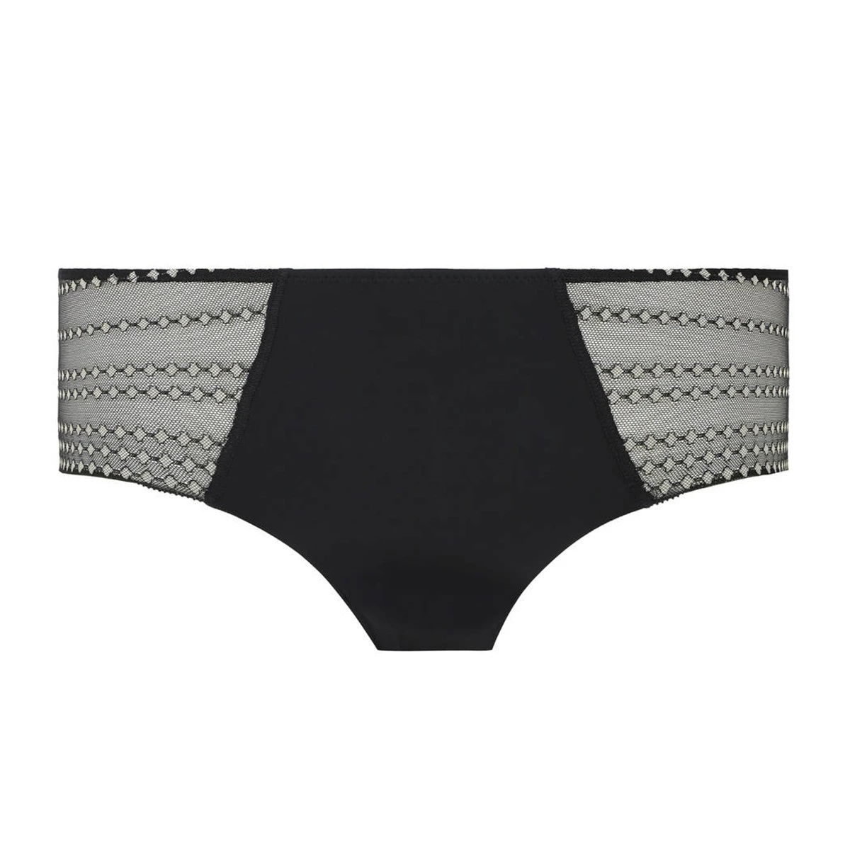 Le sublime shorty Respect noir champagne de Wacoal nous envoûte par ses motifs modernes qui redessinent joliment la silhouette. On aime la transparence de ce dessous sensuel et glamour. On apprécie la couture verticale au dos qui apporte un beau galbe aux fesses. Coup de coeur pour la coupe mi-taille haute et moyennement couvrante au dos.